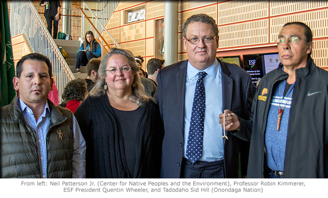 ESF President Quentin Wheeler, joined by leaders of the ESF Center for Native Peoples and the Environment, members of the Onondaga Nation and ESF students, Wednesday, Nov. 18, announced the college's recognition of its location on the original territory of the Haudenosaunee Confederacy and his intention to formally share that acknowledgement with visitors to the campus.